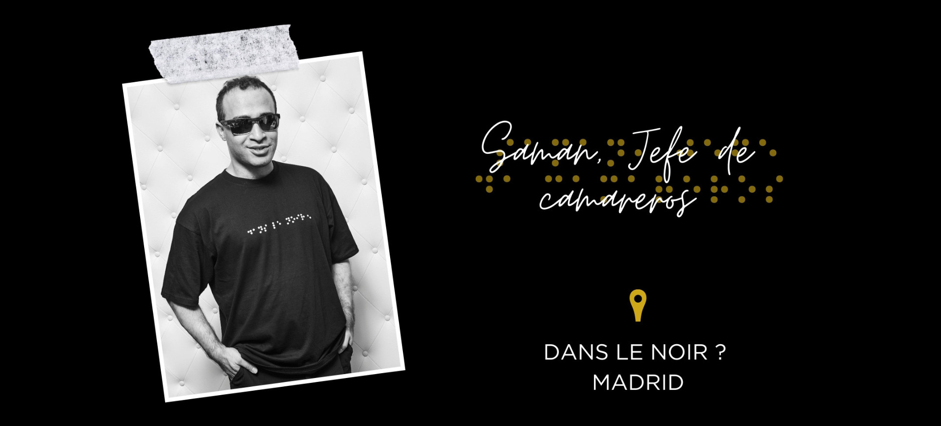 Sam fait partie de l’équipe de Dans le Noir ? Madrid depuis son ouverture en 2017. Il a rejoint l’aventure sur recommandation d’une amie qui travaillait comme serveuse-guide à Dans le Noir ? Barcelone. En 2021, il est devenu chef de salle et responsable de l’équipe : "Mon rôle a changé, je dois être attentif à tout".